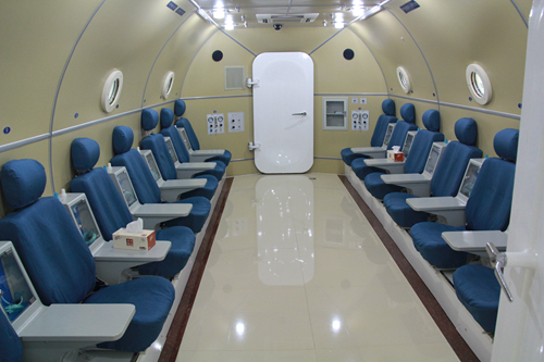 我院高压氧治疗始于2005年5月,原为6人舱。为满足病人日益增长的需求,今年1月完成扩容改造。目前使用的是20人的大型空气加压氧舱,舱内配备监护仪及气动呼吸机,将很大程度提高危重病人的抢救成功率。新的高压氧舱采用了先进的计算机自动化操舱与安全检测技术;空调系统永磁藕合感应传动变频中央送风技术;多功能综合吸氧控制技术;舱内隔离防爆型音画同步电视可视技术;供氧动态监测与流量计量技术以及分体式舱内患者生命体征监测技术等先进技术。