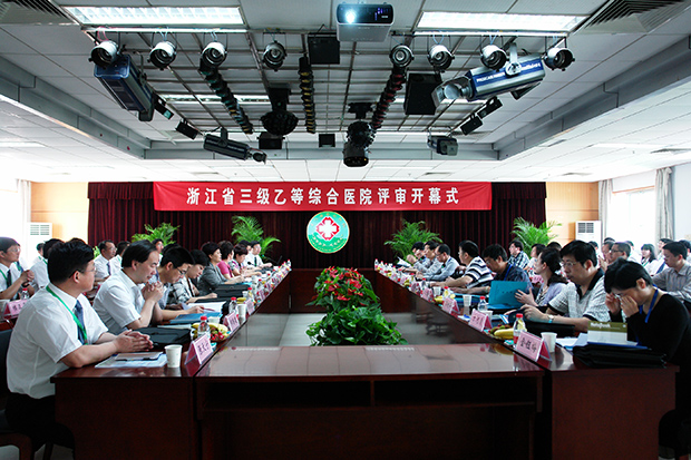 丁国强院长代表院党政班子和全院职工对省卫生厅等级医院评审组领导和专家莅临我院检查指导工作表示热烈欢迎!向一直以来关心支持医院事业发展的各级领导、各界人士表示衷心的感谢!在观看了“创新创业谱新歌”电视专题片的形式进行了三乙医院评审汇报。专题片分①站在新起点, 迎接新挑战②创新管理机制,谋求新的发展③狠抓医疗质量,确保医疗安全④创新服务模式提高服务质量⑤人才建设创佳绩,学科发展上台阶⑥公共卫生挑重担,危危难时刻急先锋⑦加强文化建设,构建和谐医院七个部分。评审专家分行政、医疗、综合三大组,以浙江省综合医院等级评审标准,通过随即抽签确定模拟急救演练、查阅资料、三级查房、问卷调查、现场提问、实地察看夜查房等形式,对医院管理、医疗质量与安全、医疗技能与保障、临床护理、医院感染与防护、医院财务、后勤保障、设备与信息管理等方面进行了全方位的检查和考评。