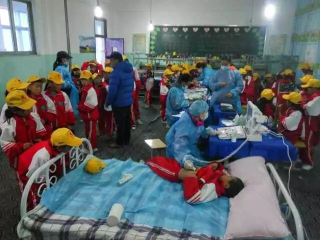 两个月时间,援藏团队担任着重大的责任,经历着艰苦的环境。工作开展当天,他们就为当地一所学校的1800名学生进行包虫病的超声检查。从早上9点开始,平均每人要检查60名学生,在这么高的海拔,胡青英医生必须一边吸氧一边工作。